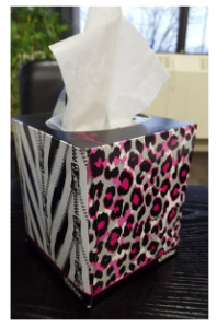 So I have this Kleenex box on my desk … not any ordinary one but rather it has pink and black and grey leopard spots on 2 sides and black and white zippers on the other two.
